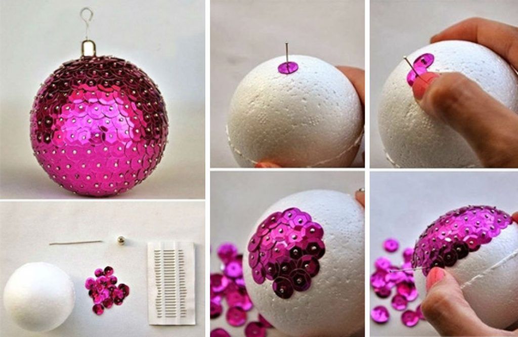 Куда более простой способ – использовать пайетки и портновские булавки с бусиной-головкой. Достаточно на каждую булавку поместить блестящий кружок и воткнуть ее в шар. Булавки размещаем вплотную друг к другу, хаотично, пока весь пенопласт не скроется под пайетками. Некоторые булавки можно дополнительно украсить длинным стеклярусом, превратив шар в подобие ежика.