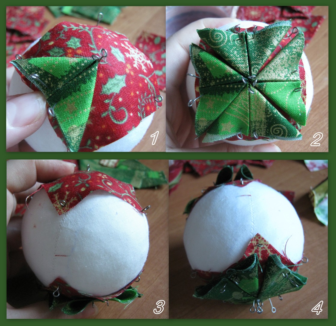 Необходимые материалы: пенопластовый шар для основы, кусочки ткани (можно использовать абсолютно любую ткань), много, очень много булавок типа «портновские гвозди» с крохотными, почти незаметными шляпками.