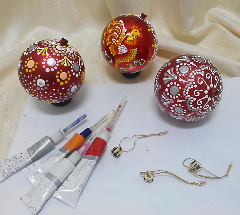 Необходимые материалы: одноцветный елочный шар, разноцветные контуры, кариловый лак, акриловые краски.