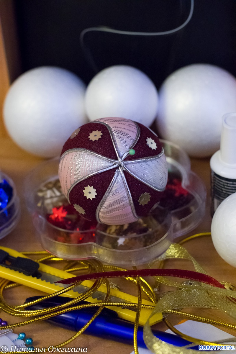 Каждая пайетка должна быть прикреплена к поверхности шарика из пенопласта с помощью швейных булавок (их используют портные).Пайетки должны располагаться внахлест.