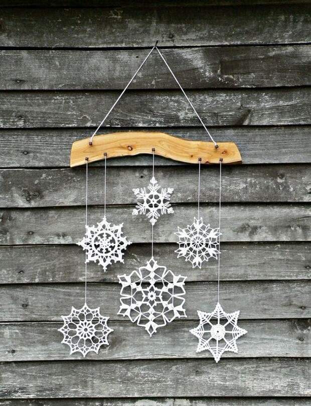 Начните с длинного куска проволоки. В зависимости от размера снежинки вам понадобится довольно большое количество. Нанизываем на проволоку пять бусинок. Затем согните верх проволоки над пятью деревянными бусинами. Это закрепит бусинки и не даст им скатиться. Возьмите оставшуюся проволоку и проденьте вторую бисеринку. Добавьте к проволоке еще две бусинки.Затем возьмите конец более длинной проволоки и проденьте через бусину у основания точки снежинки. Повторите эти шаги еще пять раз, чтобы получить шесть точек снежинки. Но на оставшиеся пять точек снежинки нанижите шесть бисеринок вместо пяти. Чтобы закончить снежинку, возьмите еще одну бусину и проденьте ее, чтобы закрыть круг в центре. Скрутите провода вместе, чтобы закрепить. Используя ножницы для проволоки, отрежьте лишнюю проволоку и заправьте концы. Чтобы повесить снежинку, прикрепите пряжу к верхней части любой точки.