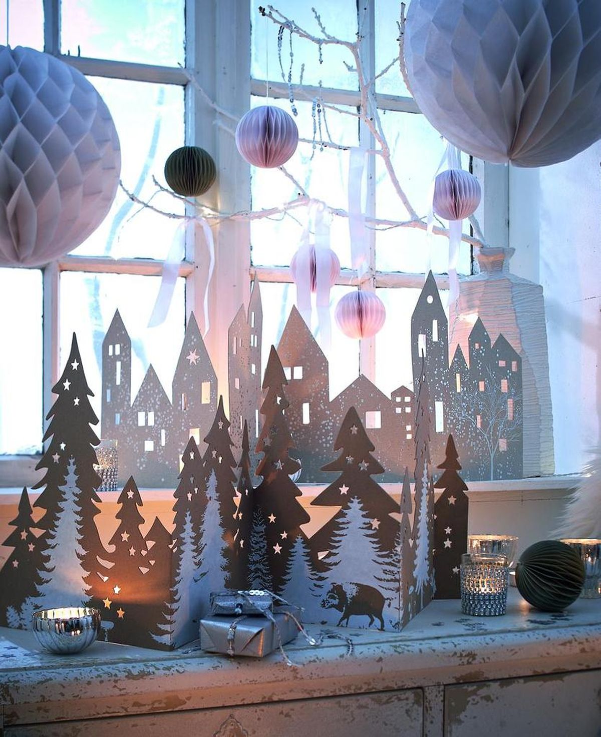 Простой и элегантный декор окна будет светиться ночью и радовать удивительными зимними пейзажами прямо на подоконнике.