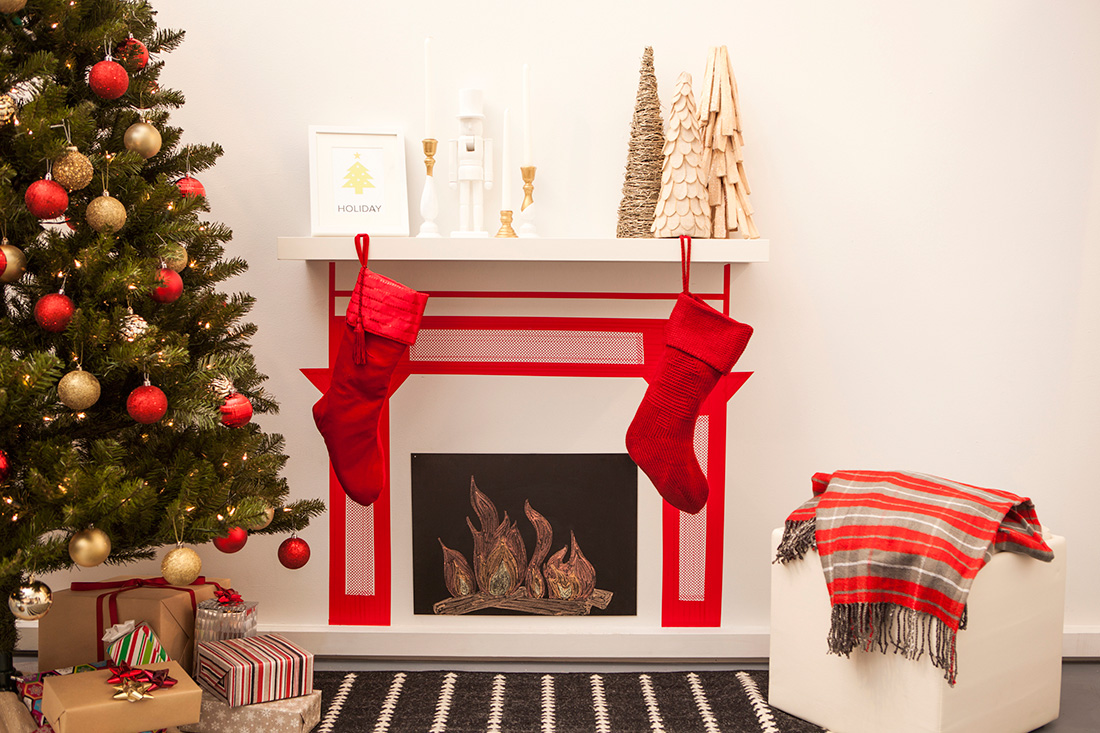 Чтобы изготовить импровизированную елку, понадобится несколько пачек цветной бумаги и двусторонний скотч. Нужно вырезать из бумаги элементы любой формы — треугольные, квадратные, круглые — и сформировать из них композицию на стене. Каждый элемент крепите к стене скотчем, а завершите композицию электрической гирляндой.