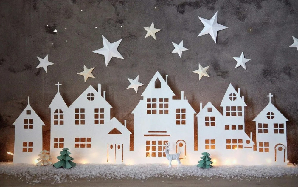- Звезды или домики с подсветкой (если приклеить внутрь объемной фигуры блок питания с батарейками).