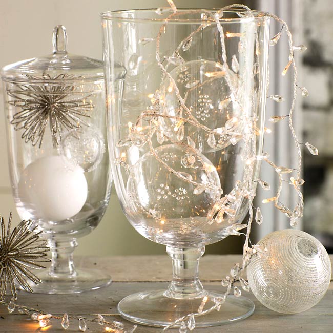 - нанесите на края сосуда клей и обмакните их в снеге, а внутри разместите гирлянды.