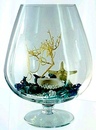 Для емкостей из стекла подойдут все способы, описанные выше, а также множество других. Они очень оригинально смотрятся, если оформить их в мозаичной или декупажной технике, расписать цветными акриловыми красками, декорировать клеем и разными крупами. Но особой популярностью пользуется внутреннее наполнение. Например, композиции: