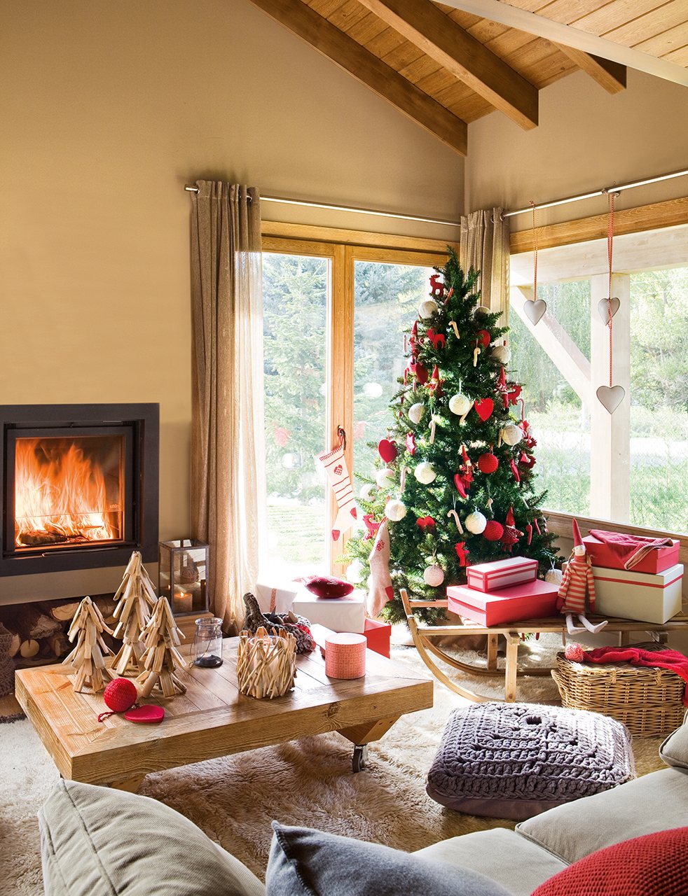 Тему домашнего уюта поддерживают мягкие подушки, небрежно разбросанные вокруг, пушистый палас, сидя на котором так удобно разворачивать новогодние подарки, заждавшиеся хозяев под нарядной елкой.