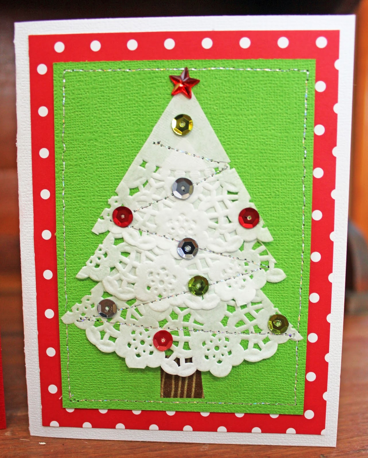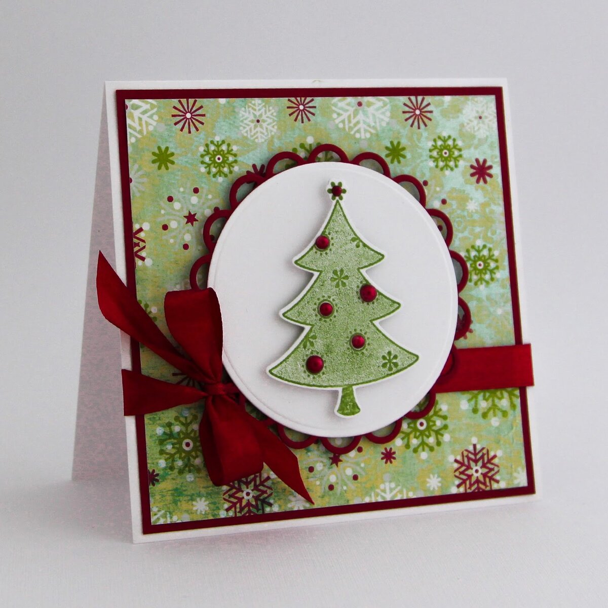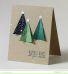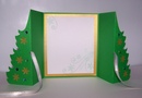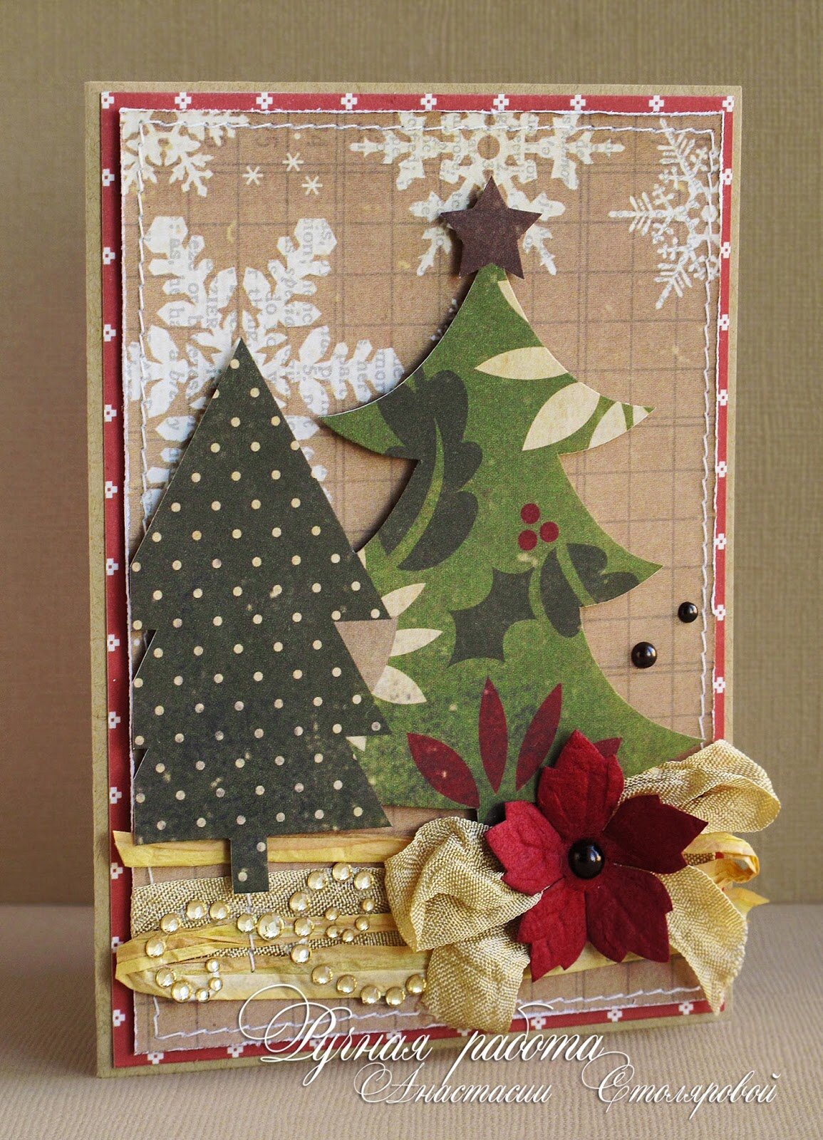 Как вариант, можно вырезать из разного оттенка зеленой бархатной бумаги несколько маленьких елочек и поместить их вверху листа, над атласной лентой.