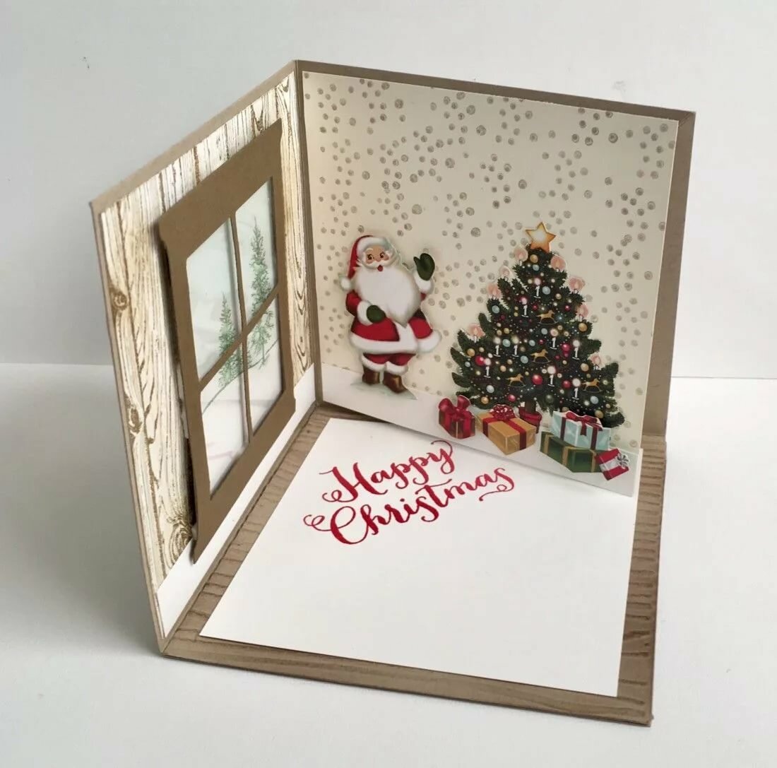 - Деда Мороза можно поместить на внутреннюю часть, чтобы он выглядывал в окошко, вырезанное на лицевой стороне.