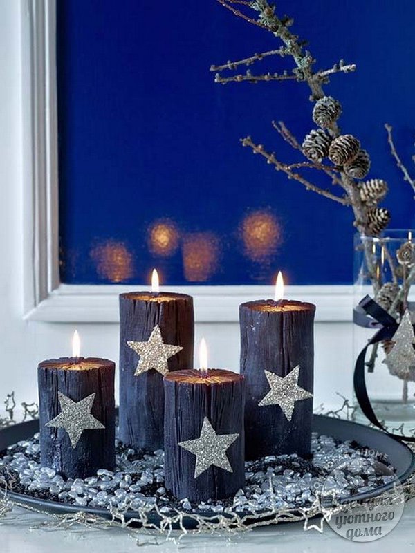 Добавят уюта свечи. Простые стеклянные бутылки при помощи кристальной пасты или моделирующих гелей, глиттеров и витражных красок могут превратиться в изумительные подсвечники.