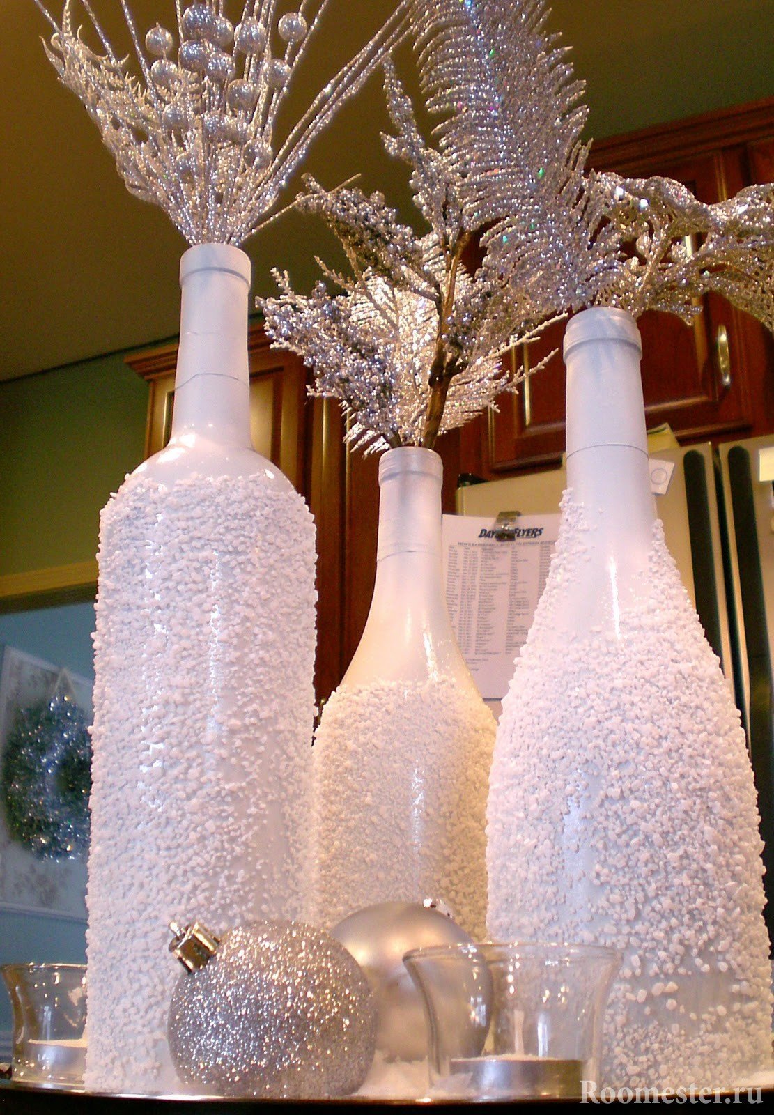 Шампанское также можно задекорировать. Можно просто закрасить бутылку белой краской, наклеить понравившийся мотив с салфетки. Горлышко обернуть еловой веточкой или бантом. Индивидуальность и эпатажность бутылки шампанского на вашем столе будет зависеть только от вашей фантазии.
