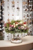Самый простой вид новогоднего букета — это несколько изящных сухих веток, украшенных новогодними игрушками. Также можно совместить цветы (сухоцветы или искусственные) с еловыми ветками и шишами. Быть может даже припорошенные белой или золотой краской.