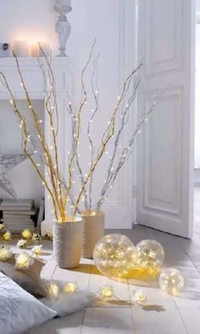 Для изготовления новогодней композиции можно взять большую ветку любого лиственного дерева, очистить ее от сучков и листьев, вскрыть серебряной или золотой краской из баллончика и украсить елочными игрушками. Такая композиция будет смотреться изысканно в гостиной. Ее можно оставить здесь и после окончания новогодних праздников, только сменить декор.