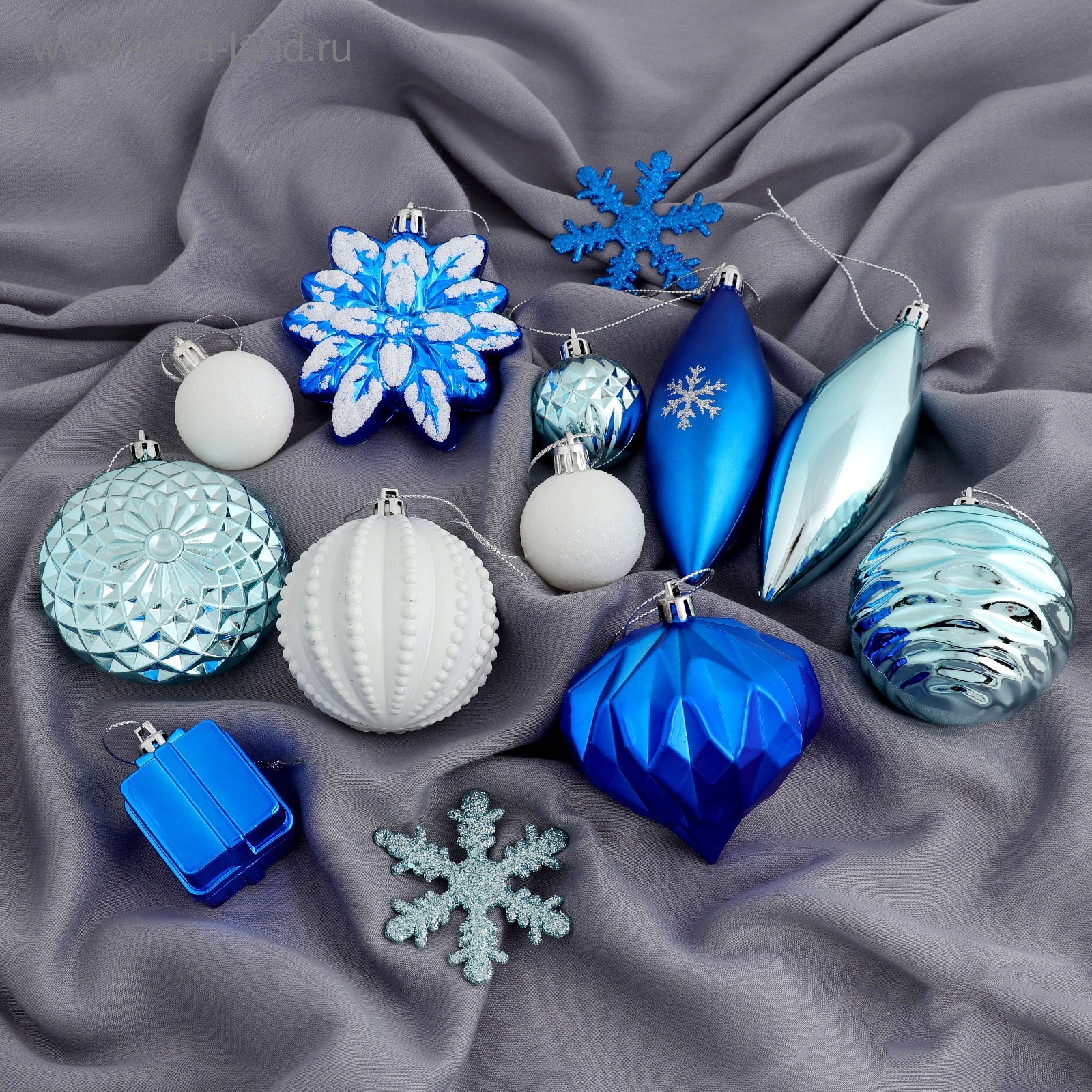 Нам нравятся наборы новогодних игрушек Сноубум голубого и белого цвета. И если голубые елочные украшения имеют глянцевую поверхность, то белые шары декорированы глиттером. А вместе это поистине роскошная композиция. Еще одно интересное решение — новогодние игрушки оптом в синих тонах. Изделия диаметром 6 см продаются в целлофановых пакетах по шесть штук.