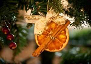 Подойдут засушенные дольки цитрусовых, елочные игрушки небольших размеров, засушенные веточки рябины или калины, шишки.