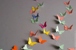 Используют бумажные бабочки для создания объемных декоративных композиций на небольших обручах с привязанной к ним леской. На леске закреплены вырезанные бумажные насекомые. Их на стену не повесишь, но смотрятся они очень оригинально, хотя создавать такую композицию сложнее, чем на стене.