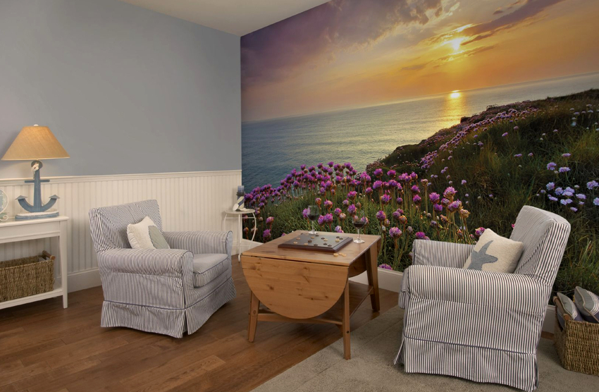 Визуально увеличить комнату можно также с помощью панорамных обоев, декоративных панно, настенной росписи или обоев с рисунком trompe-l’oeil. Их можно использовать для целой стены или ее части в гостиной, либо украсить ими стену у изголовья кровати в спальне. Пейзаж на стене поможет создать дополнительную перспективу, которой не хватает взгляду в небольших помещениям, и создать эффект бесконечного, уходящего в даль пространства.