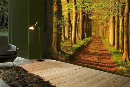 Интересного эффекта можно достичь, если использовать фотообои с эффектом 3D, когда уходящая вдаль перспектива на одной стене уводит на природу, а с другой стороны имитирует дверь. Правда, получится ощущение проходной комнаты, зато она будет казаться намного больше, чем на самом деле.