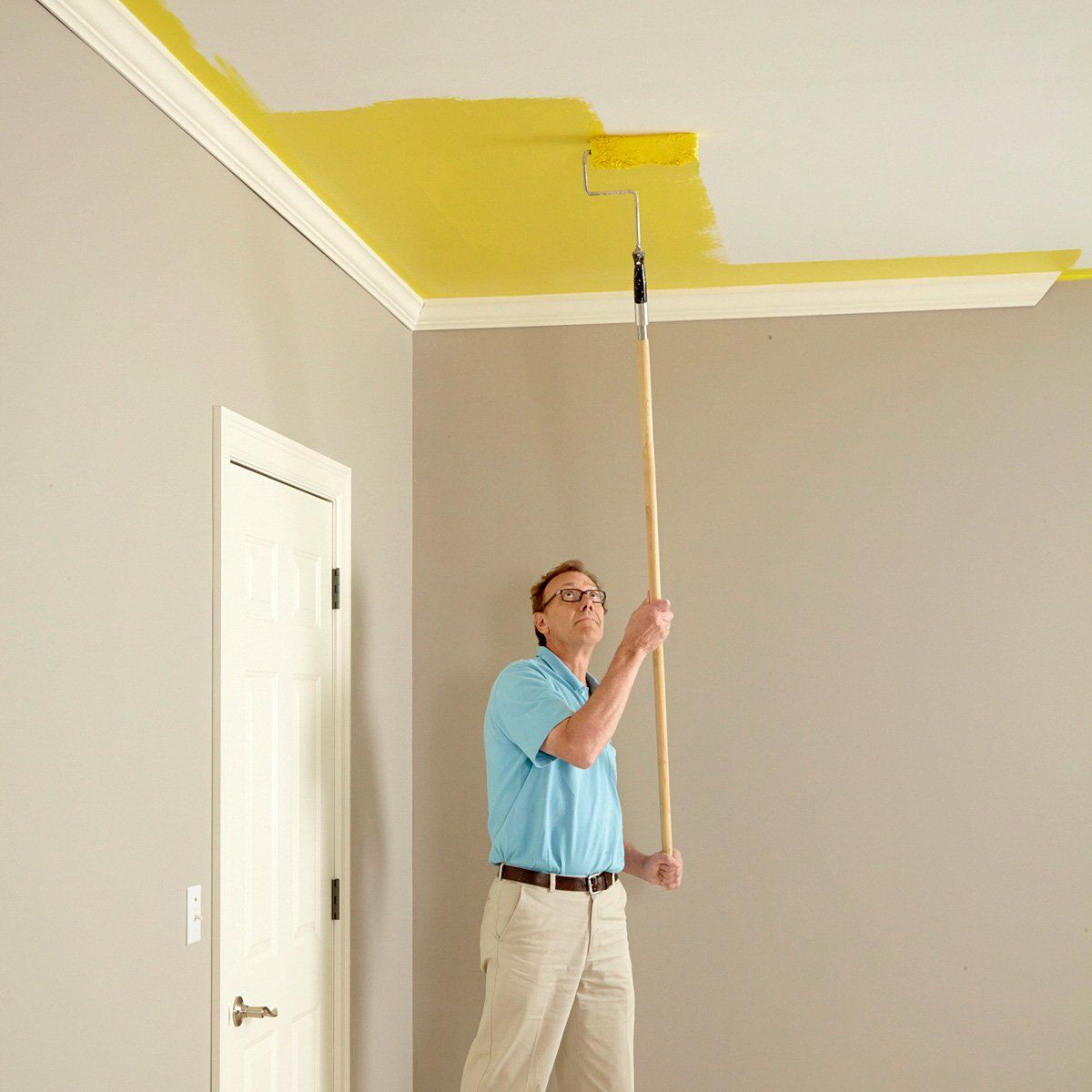 - Краска и валик: «Большинство потолков окрашено в белый цвет латексом», — говорит Липфорд.Достаточно на два слоя. Отличный совет — купите краску для потолка с грунтовкой в комплекте. Если вы красите стены, простой способ избежать обрезки верхних краев стены — это покрасить стены и потолок в один цвет.