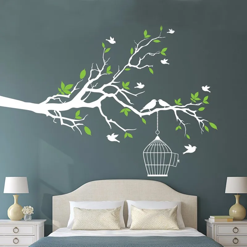 Возле кроватки на однотонной стене рисую или наклеиваю дерево с красиво изогнутыми ветками. В продаже имеются различные варианты виниловых наклеек, включая кроны с элементами литтеринга. Надписи с буквенной имитацией листвы или в виде порхающих птичек – слов смотрятся оригинально.