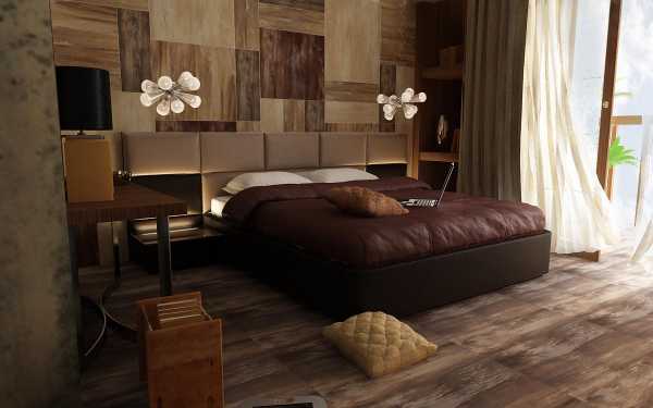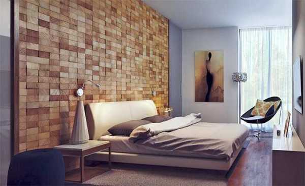 Если нет возможности купить натуральные материалы, не расстраивайтесь, ведь в магазинах есть обычные обои под дерево на любой вкус и кошелек. Чтобы правильно их подобрать следует определиться с общим стилем помещения, а также учесть его назначение. Редко бывает, когда покрытия, имитирующие древесину, используют для оклейки всех стен в комнате, даже если взять светлые ненавязчивые тона: бежевый, песочный, — интерьер будет выглядеть скучно и однообразно. Поэтому, для создания интересного дизайна, чаще применяют темные или яркие обои. В спальне они подойдут для создания акцента на однотонных стенах, уместнее всего их наклеить в виде панно позади кровати или перед ней. Зачастую в данном случае применяют фотообои. Одним из современных решений для оформления спальни является использование покрытий, имитирующих мозаику из деревянных элементов. Этот вариант придаст динамики и оригинальности помещению. Для того чтобы интерьер спальни имел законченный вид, желательно наличие элементов, которые повторяли бы цветовую гамму древесных покрытий, например, шторы, ковры, мебель или покрывало.
