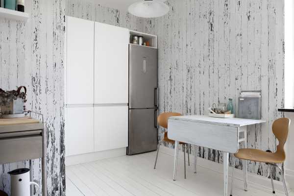 Обои под дерево идеальное решение для кухни или столовой, но только в варианте покрытий на флизелиновой основе. Такими обоями уместно оформить рабочую зону, в этом случае хорошо будут смотреться комбинации из мелких элементов. Они хорошо сочетаются почти с любой кухонной мебелью, так что не придется ломать голову над поиском мебели подходящих тонов. Для обеденной зоны лучшим решением станут реалистичные фотообои, имитирующие деревянные доски, они могут быть темных или светлых тонов, в зависимости от того, какой эффект вы хотите получить. Но в этом случае следует учитывать, что покрытия пола и стены должны гармонировать между собой по цветовой гамме.