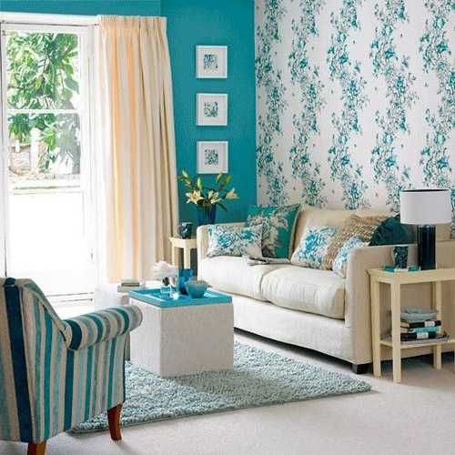Хорошо будут смотреться блестящий или металлизированный рисунок, такой эффект придаст гостиной нотку парадности. Для классического стиля лучше выбирать обои с мелким принтом. Обратите внимание на освещенность комнаты, для зала с окнами выходящими на юг, лучше выбирать холодный голубой, синий, серый или бирюзовый оттенок.