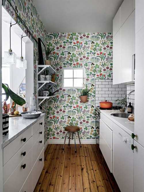 На фото кухня со стенами облицованными обоями с цветочным узором.