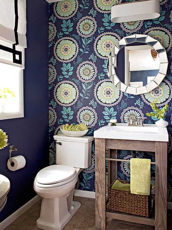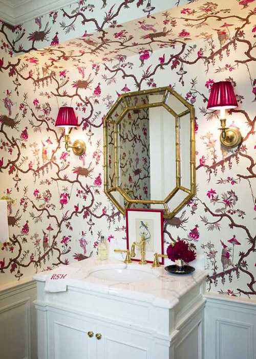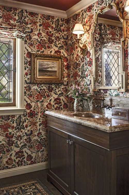 Цветочными обоями также можно частично или даже полностью заменить традиционную плитку. Зависит это от размеров ванной комнаты и влажности, которая создается в помещении при принятии водных процедур.