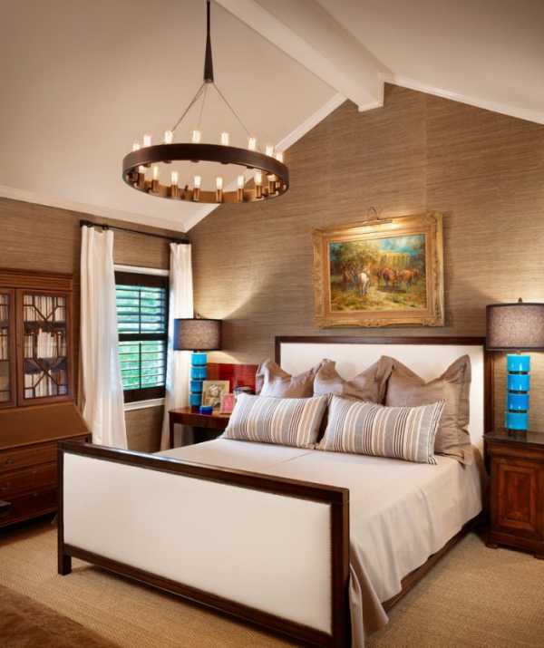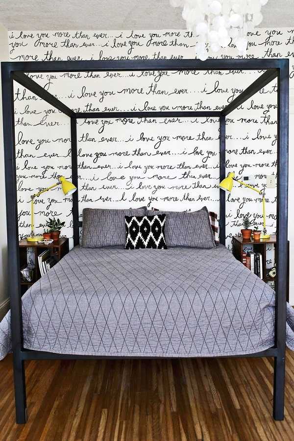 В случае спальни, активный принт лучше разместить за изголовьем кровати, чтобы не мешал сну. Стену напротив кровати рекомендуется оклеить лаконичными обоями спокойной расцветки.