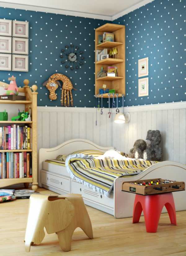 Детской чужды тёмные и кричащие решения. А вот добавить яркости порой хочется. Сделать это можно следующим образом – поместить динамичный орнамент в игровой зоне. Здесь он будет работать оправданно – бодрить малыша и наполнять энергией.