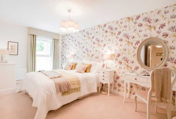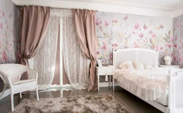 На фото спальня в стиле прованс и обои с цветами на стенах.