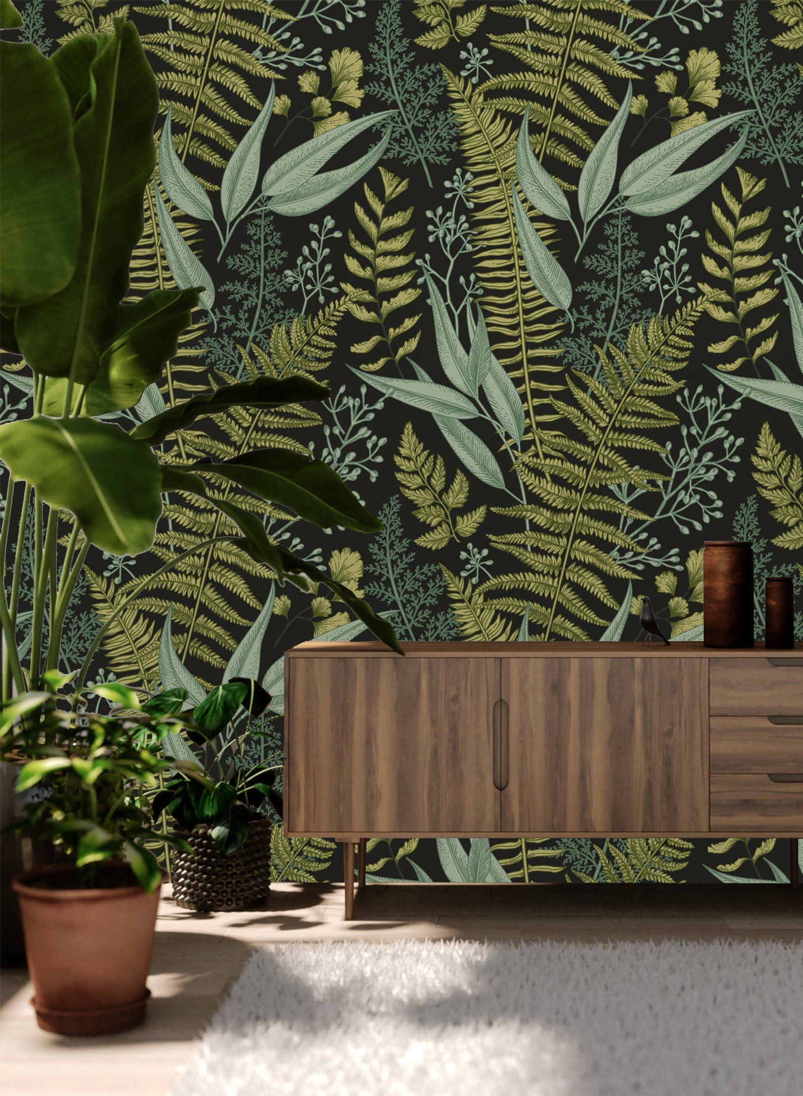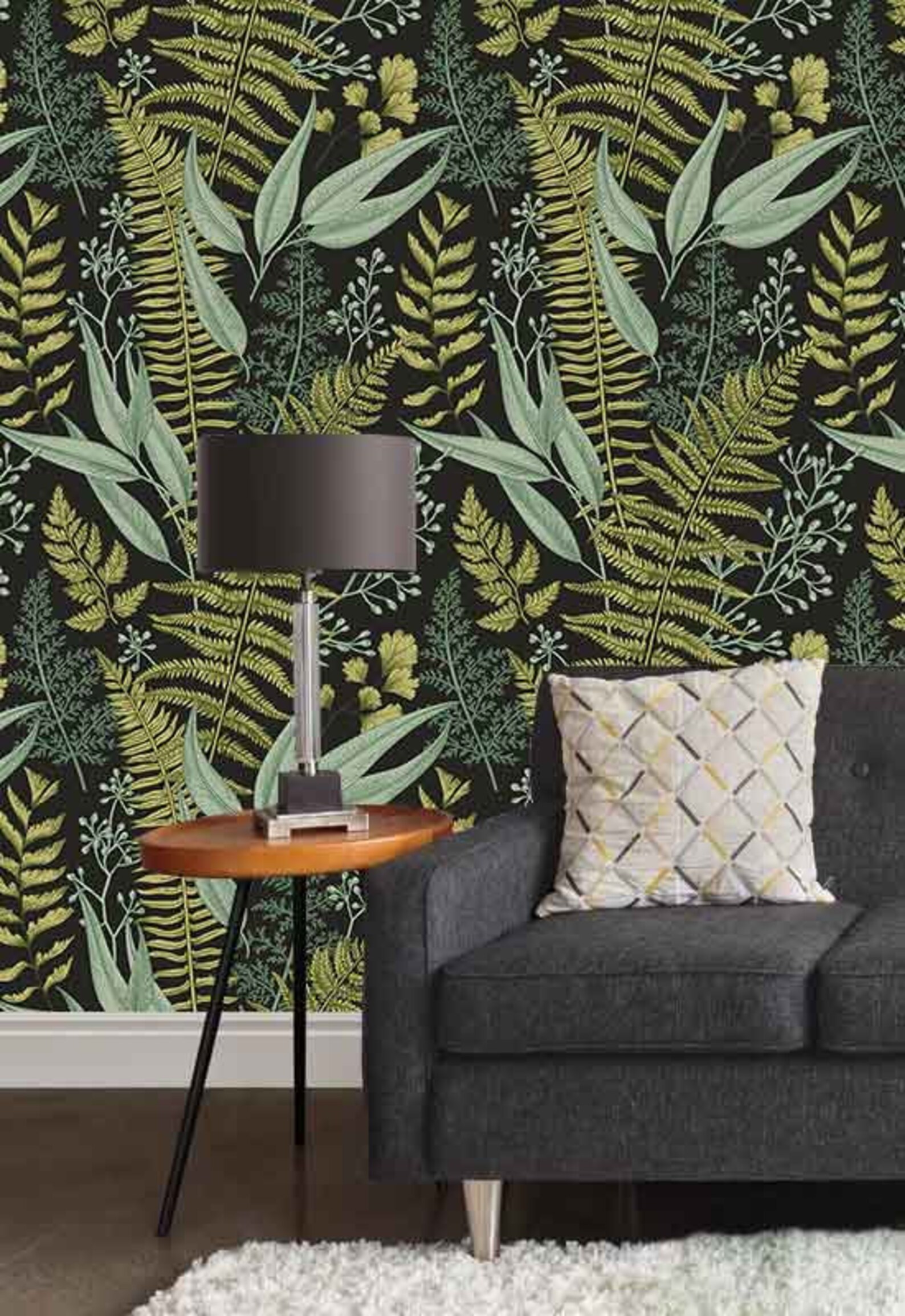 Изящный, похожий на кружево дизайн листьев делает их привлекательными для женственных стилей, таких как викторианский стиль или шебби-шик. Обои с рисунком папоротника смелых контрастных цветов также могут быть эффектно использованы в комнате, оформленной в эклектичном стиле.