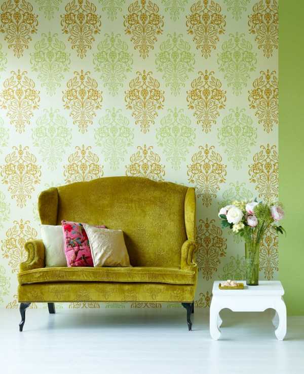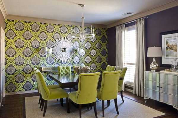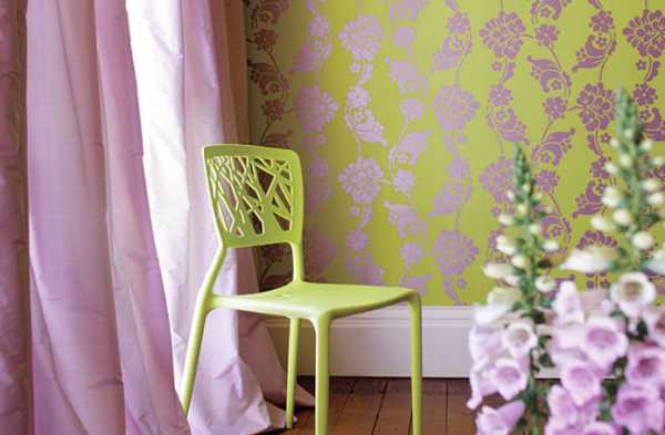 На фото интерьер и салатовые обои с сиреневым узором.