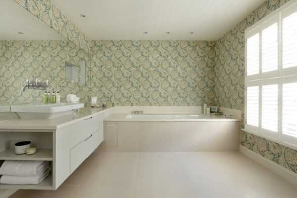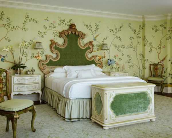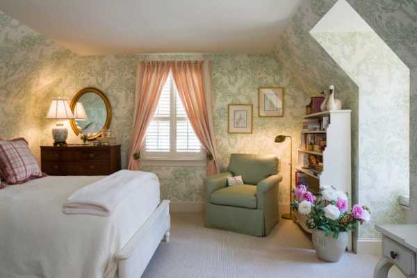 Фото 6. Традиционный дизайн со светло-зелеными обоями с растительным орнаментом.