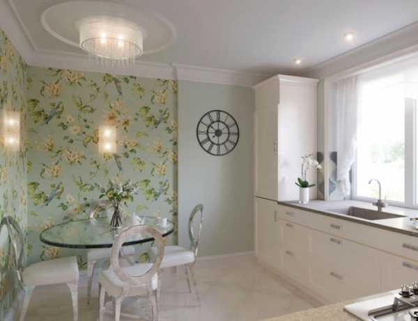 Фото 5. Бело-зеленые обои с растительным орнаментом в дизайне кухни использованы для акцентирования столовой зоны.