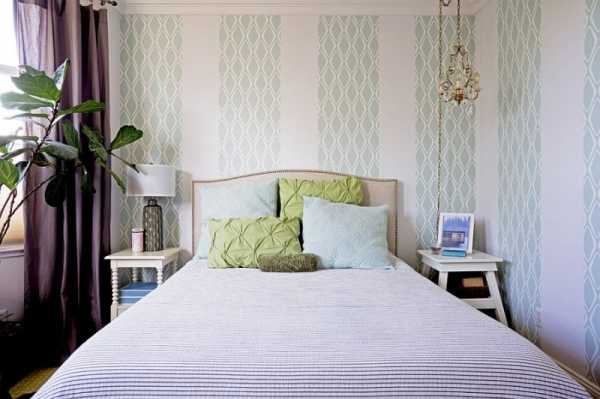 На фото спальня со стенами облицованными виниловыми обоями.