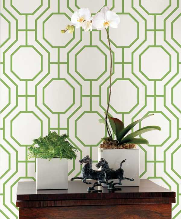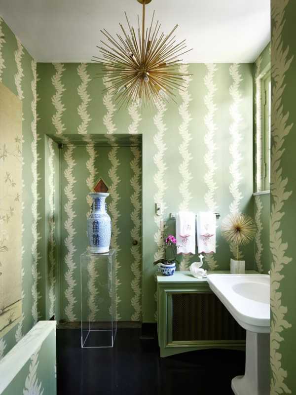 Здесь особенно будут уместны обои салатового цвета, например хорошо будут смотреться светло-салатовые стены с крупным принтом или массивной геометрией.