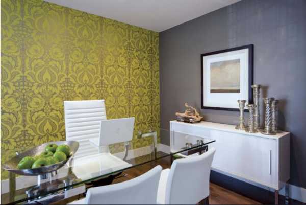 Строгая и сдержанная классическая обстановка оживает и расцветает с появлением салатовых обоев в интерьере.