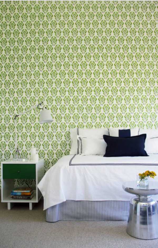 Спальня предназначена для отдыха, поэтому окружающая обстановка здесь должна иметь определённый настрой. Зелёные обои в спальне будут вполне уместны. Идеальным будет фисташковый, мятный, салатовый и другие нежные оттенки. Яркий акцент может присутствовать, он должен располагаться в прикроватной зоне, акцентируя на ней внимание. Уместным будет интерьер как в однотонном варианте, так и в сочетании с нежными оттенками других цветов. Узоры в спальне, как правило, не выглядят хорошо, здесь больше подойдут именно однотонные обои.