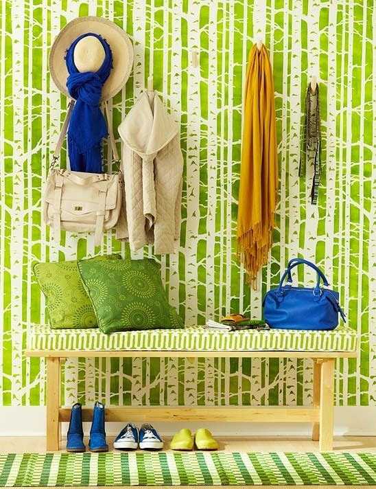 Выбирая яркие стеновые покрытия в прихожую, вы будете получать массу приятных эмоций и чувство непринужденной атмосферы. Засчет салатового цвета в таком маленьком помещении будет всегда светло и солнечно. Визуально расширят пространство и приподнимут потолок.