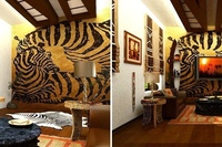 Для стен можно подобрать обои которые имитируют окраску диких зверей или кожу рептилий. Выгодным использованием может стать однотонная комбинация с хищным принтом.