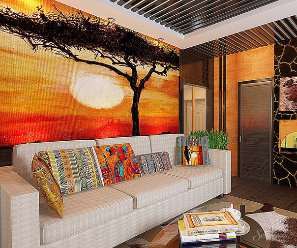 Помещение, оформленное в африканском дизайне должно быть максимально схоже с песочными саваннами и жарким солнцем.