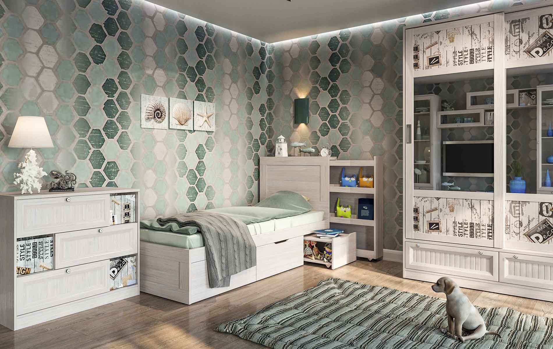 Пусть юношеская романтика, драйв, ритм и останется на поверхности в комнате — любые рассказы, картинки, узоры, передающие это движение, начало пути, покорение мира, будут очень кстати.