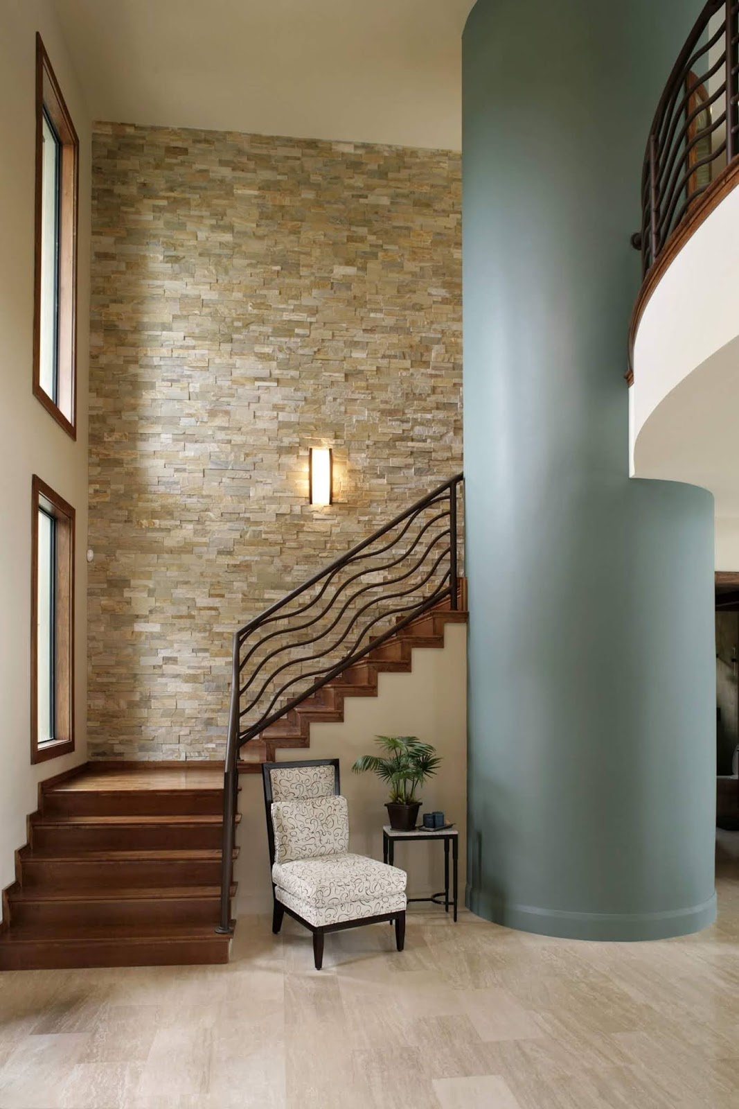 Поверхности оформляют в теплых цветах. Чтобы расставить акценты, приобретают яркие ковры, занавески и другие аксессуары.Интерьер прихожей в частном доме с лестницей фото