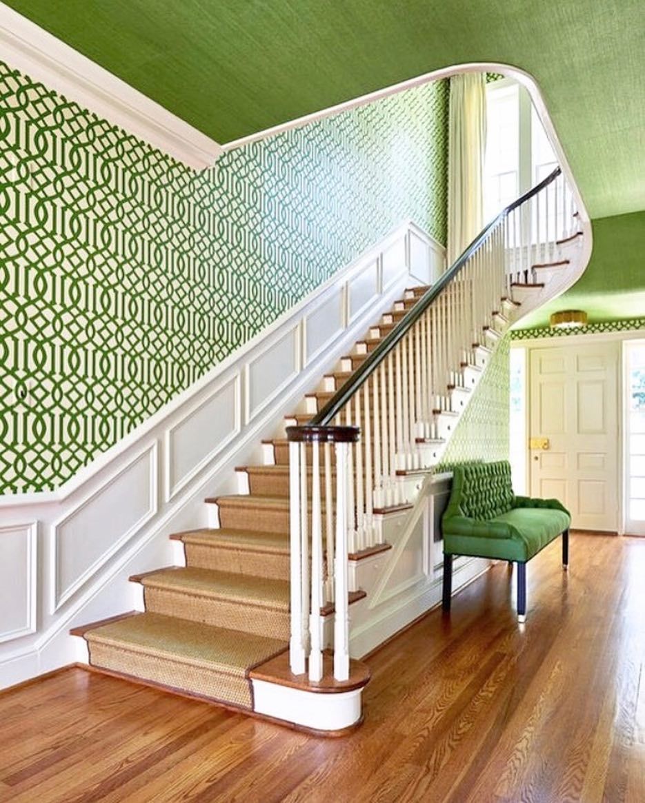 Если оклейка обоями всей комнаты кажется слишком сложной задачей, лестницы — идеальное место для этого. К счастью, часто есть логические точки начала и конца для бумаги — просто убедитесь, что вы выбрали виниловую бумагу для долговечности, потому что ваша лестница — это место с высокой проходимостью.