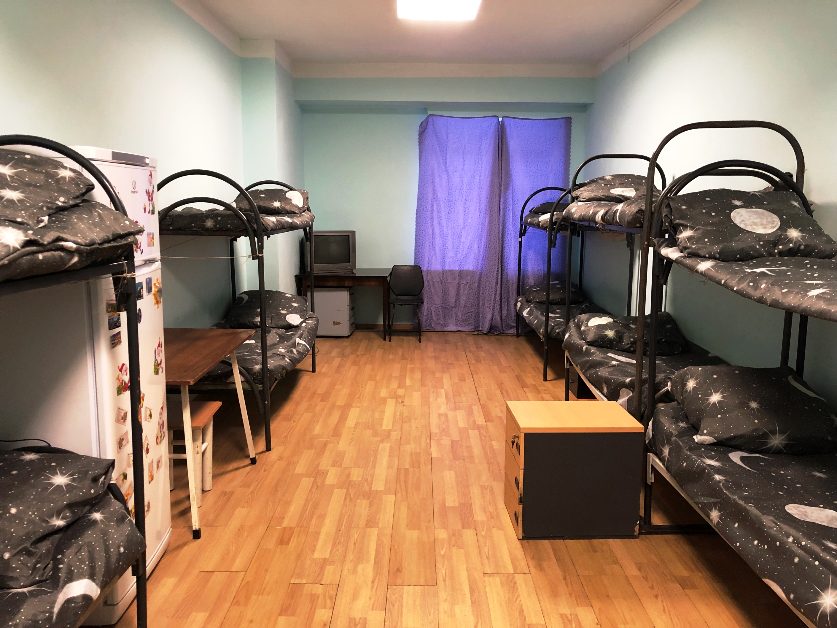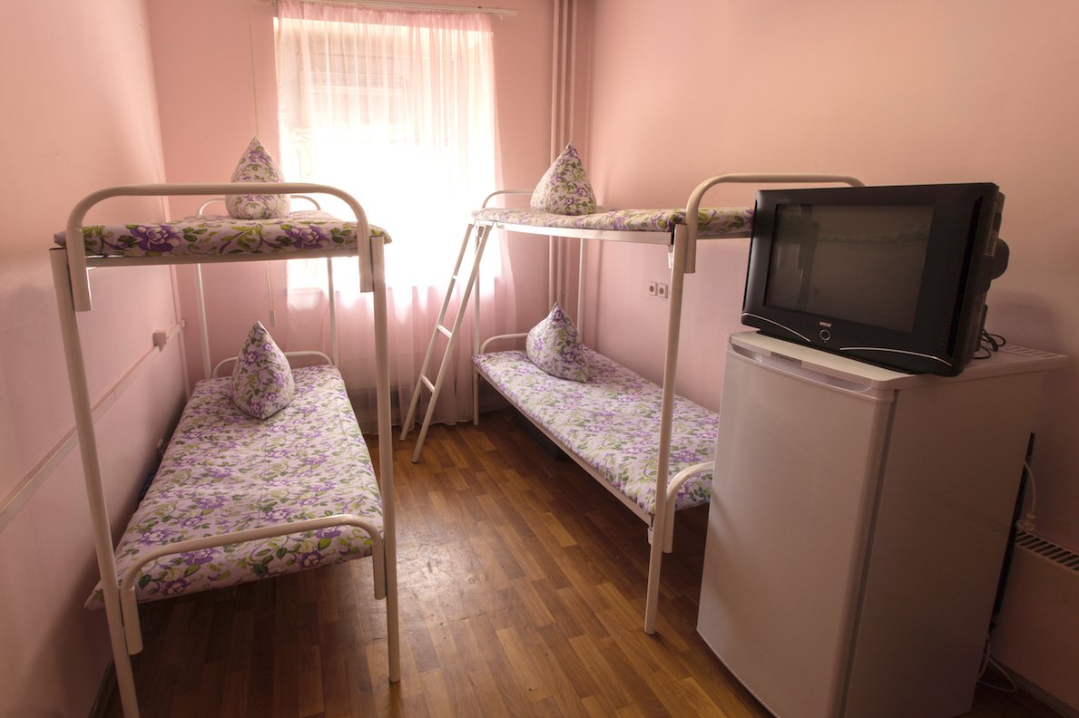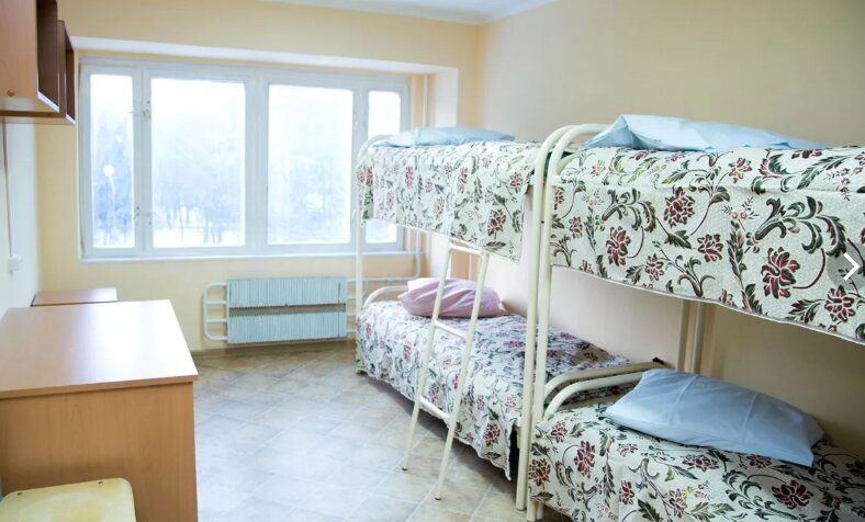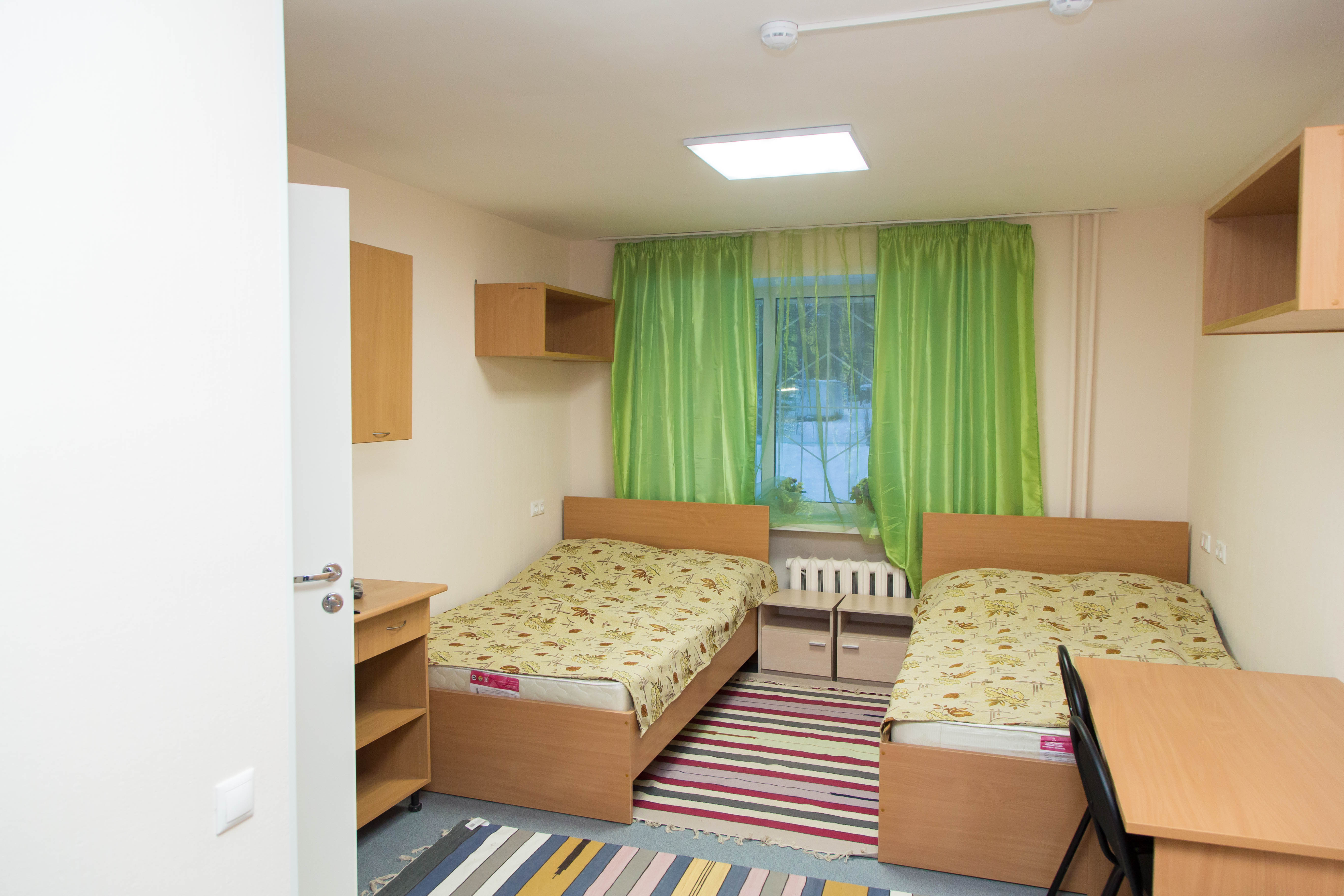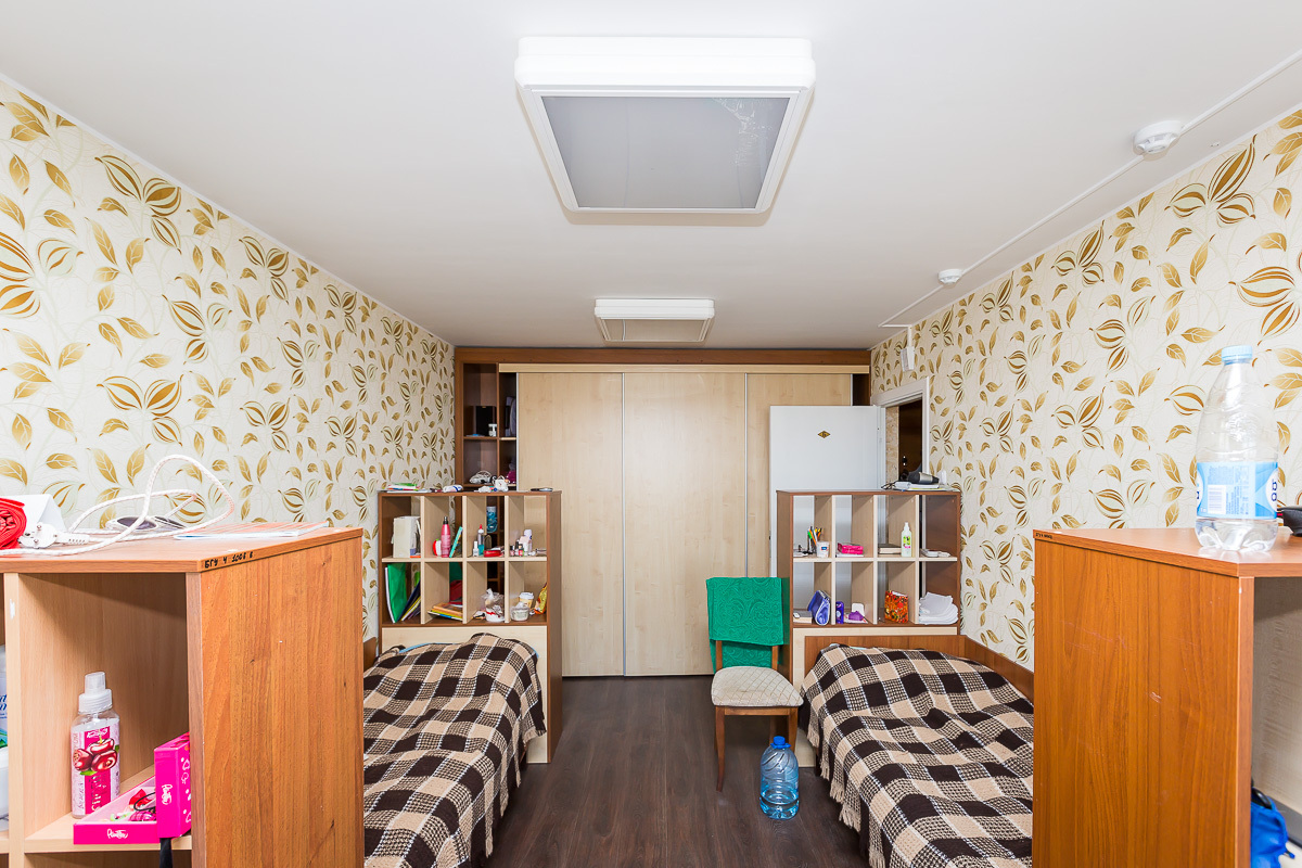- Просторные общежития — полотенце, туалетные принадлежности, удобные кровати, шкафчики, полка, свет.