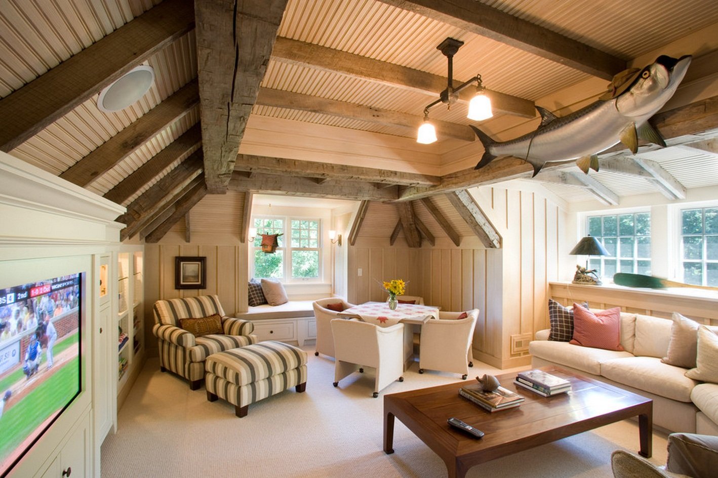 Каждое из мансардных помещений выполнено в определенной манере, а точкой отсчета стал холл, классическое оформление которого соответствует дизайну нижних этажей дома.