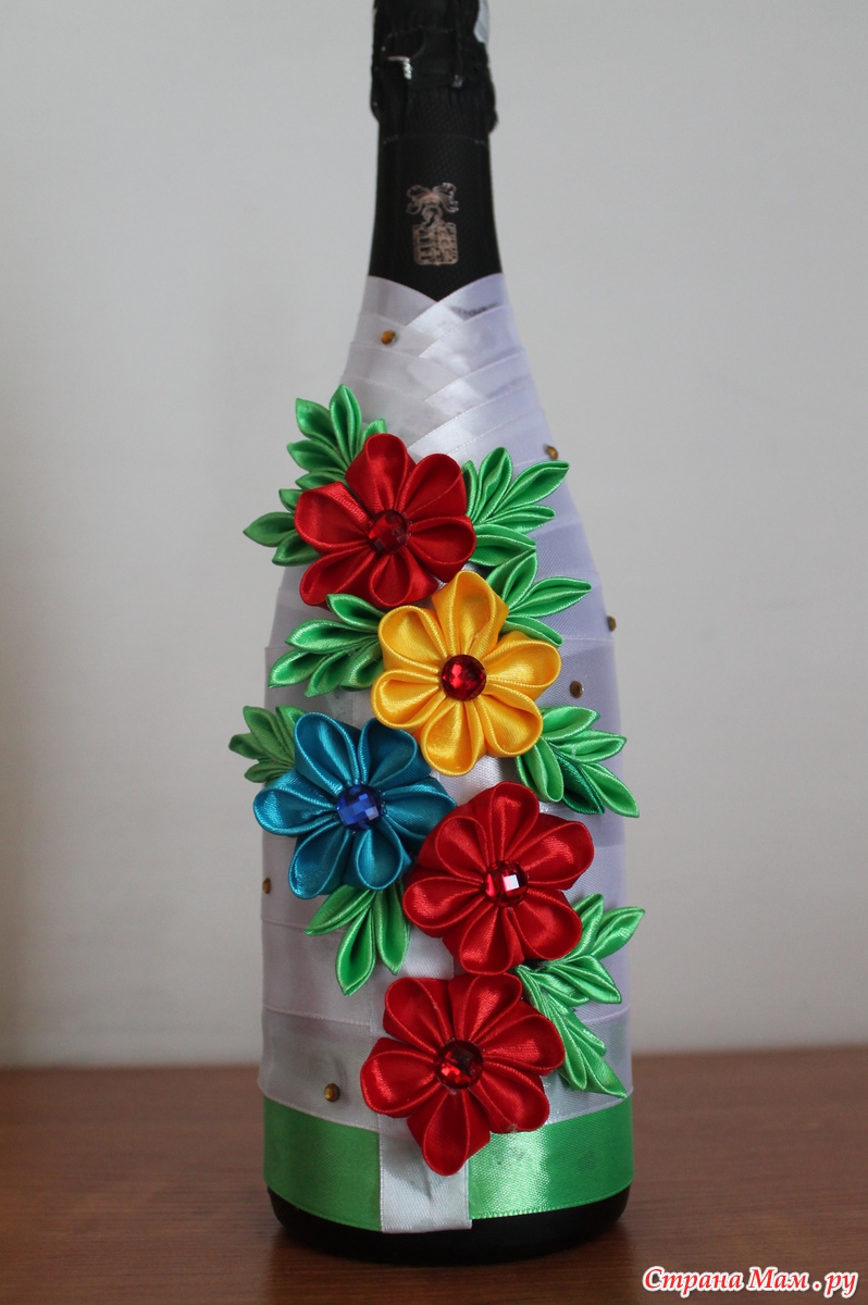 Украшение бутылки атласными лентами