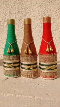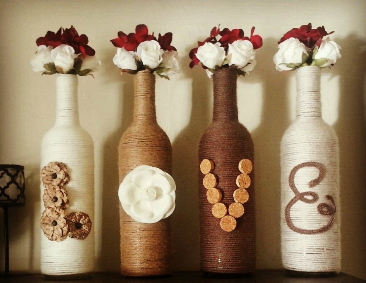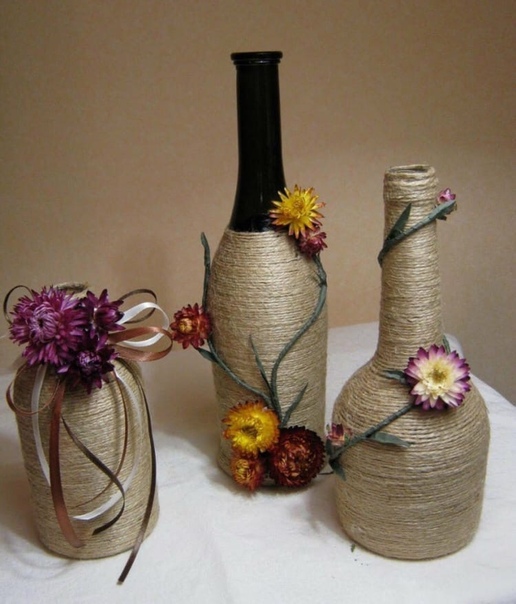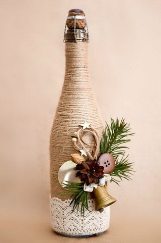 Можно рассмотреть несколько различных вариантов украшения бутылки шпагатом. Сначала можно обмотать шпагатом всю бутылку. Как вариант, вы можете приклеить шпагат посередине бутылки. Наконец, вы можете клеить только горлышко и основание бутылки шпагатом.